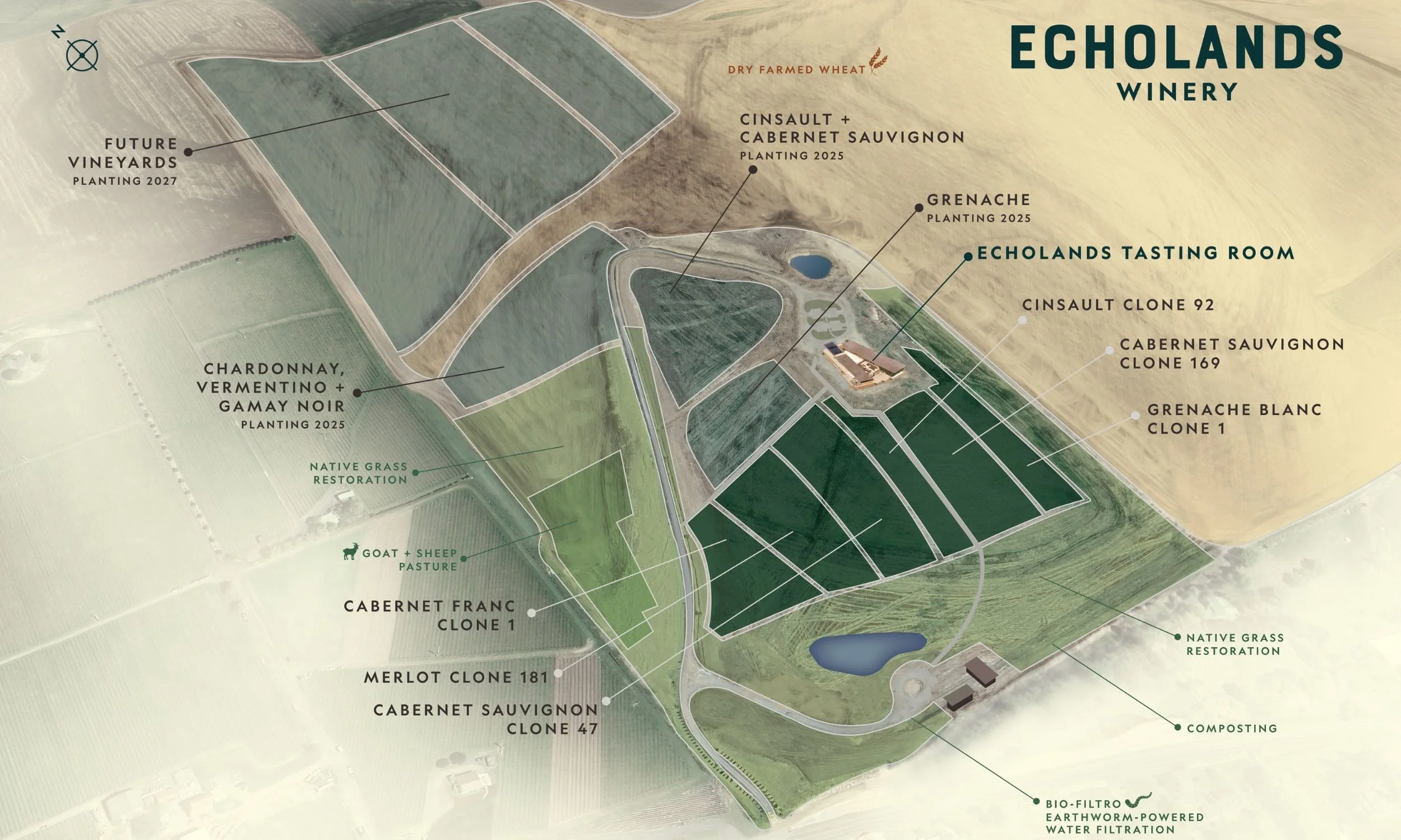 Echolands Winery was created in 2018 by two Kansas City residents, Brad Bergman and Doug Frost MS, MW, who believed in the Walla Walla Valley AVA’s ability to offer a distinctive style of wine. Since then, winemaker/general manager Brian Rudin has taken the helm as we move towards regenerative organic viticulture. Throughout, our goal is to craft responsibly produced wines that reflect the potential for elegance and balance from this singular place.